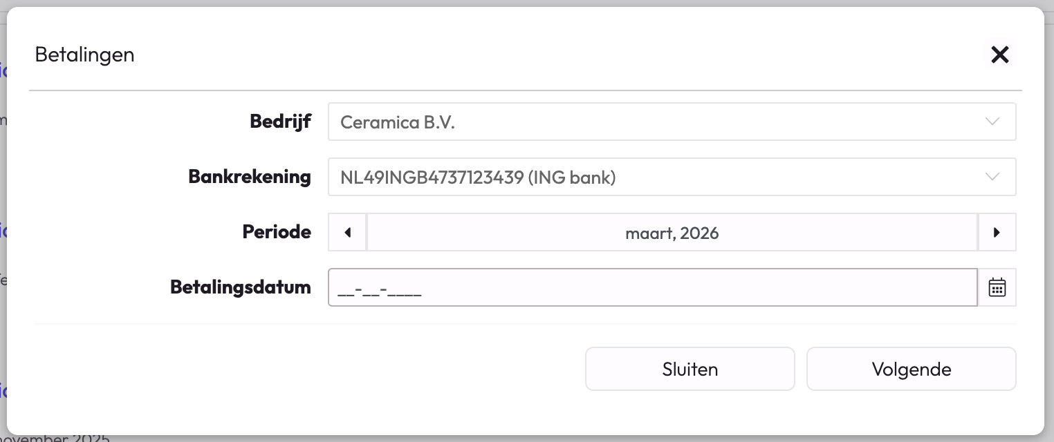 Ga naar het tabblad 'Betalingen' en klik op het plusteken rechtsboven en maak een nieuwe betaling aan voor het bedrijf waaronder de nieuwe medewerker valt. Kies juiste periode en de betaaldatum. Klik op 'volgende'.