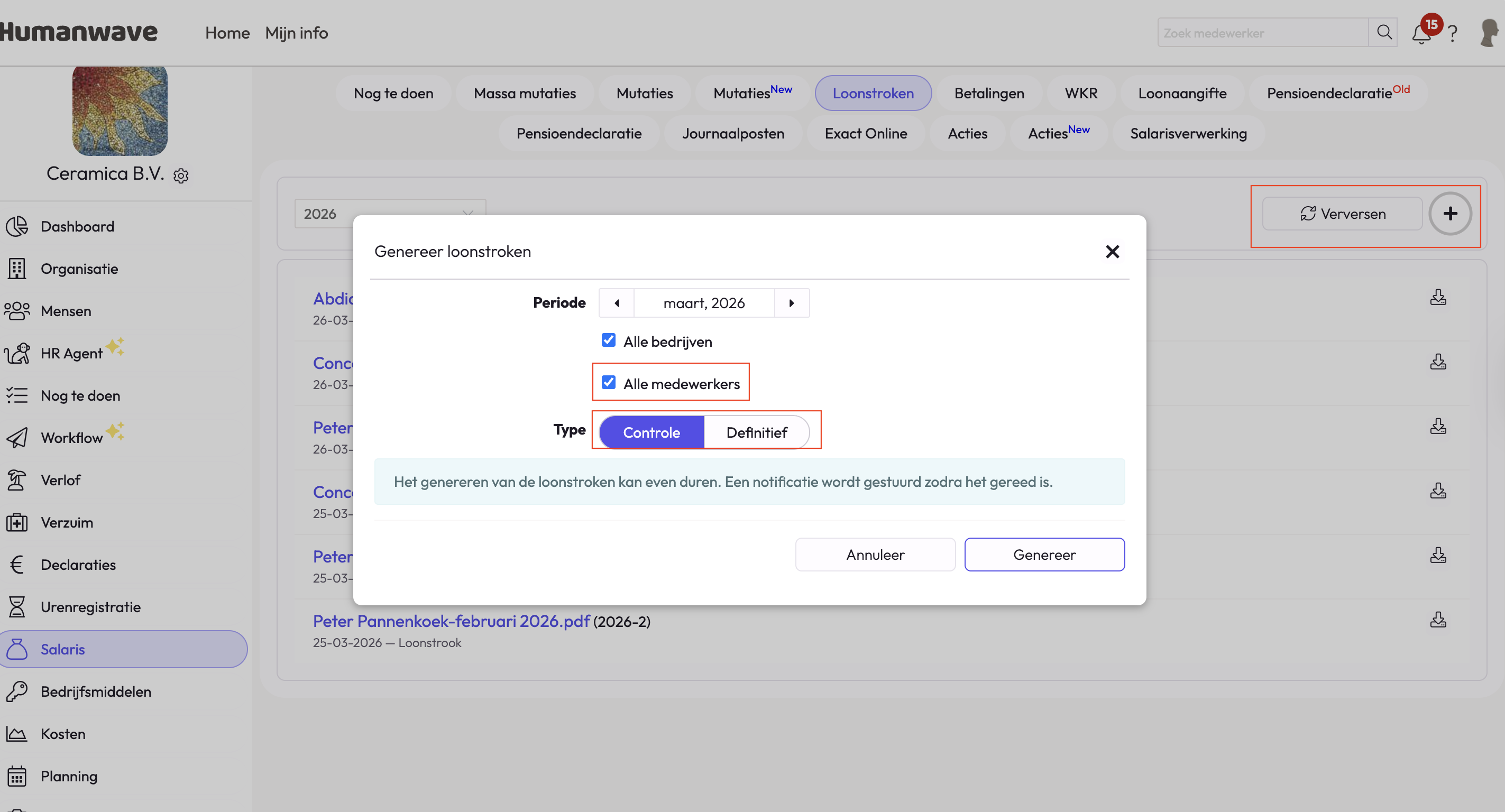 Ga terug naar de organisatie en vervolgens naar het Salaris menu en klik op de kop: 'Loonstroken'.