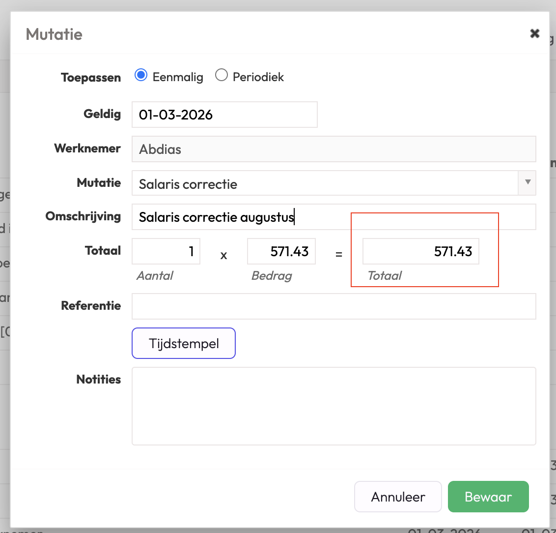 Indien de medewerker ook een reis- en/of onkostenvergoeding ontvangt, dan kan je deze ook toevoegen als eenmalig component in de arbeidsrelatie. Kies voor de mutatie(s) de datum van de periode waarin je het salaris alsnog uitbetaald.