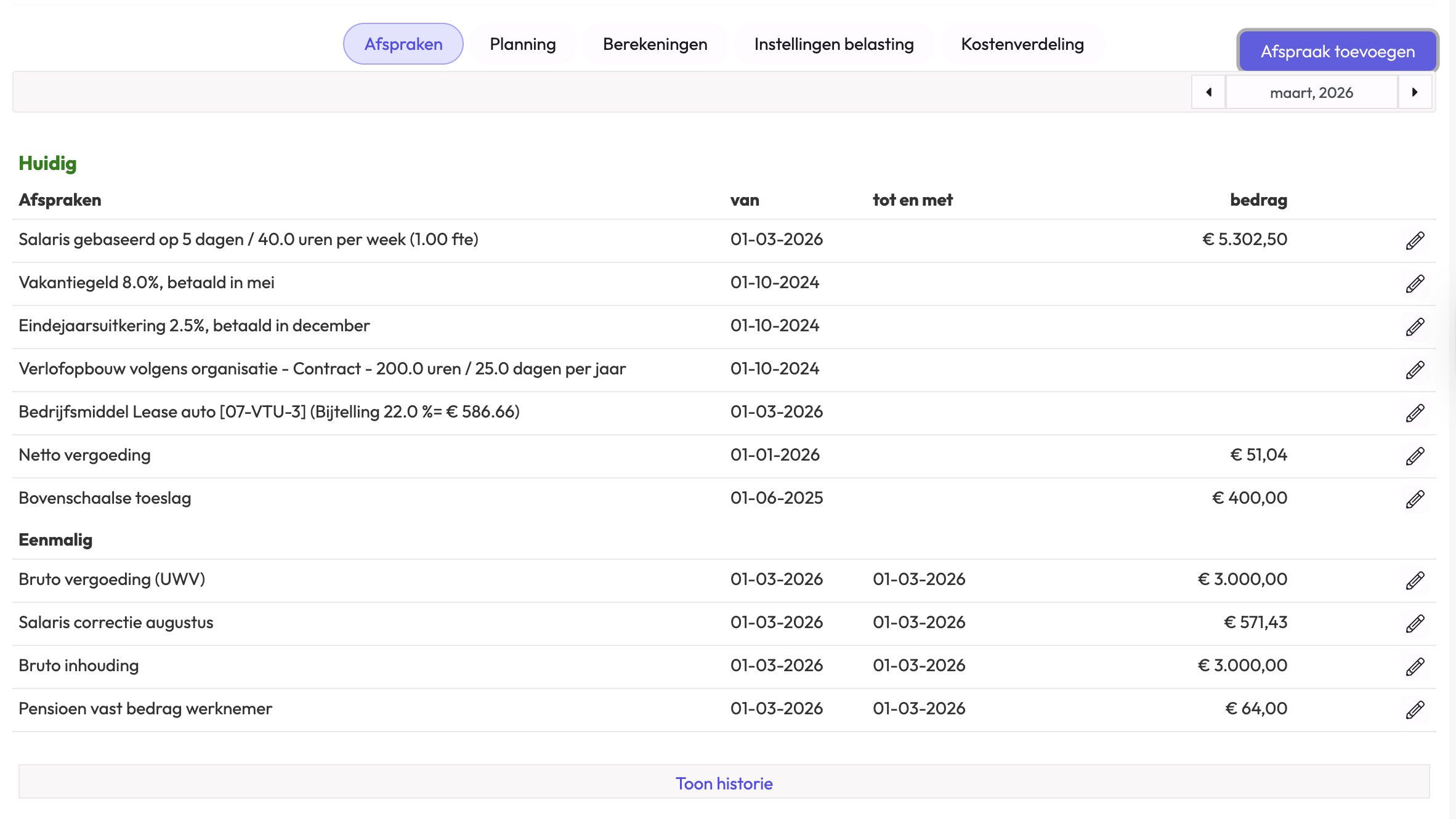 Klik op het potlood van de salarisafspraak en kies voor 'Huidig aanpassen'. Wijzig de startdatum naar de eerste dag van de maand waarin de correctie plaatsvindt. In dit geval is dit 1 augustus, de medewerker heeft over augustus immers geen salaris ontvangen.