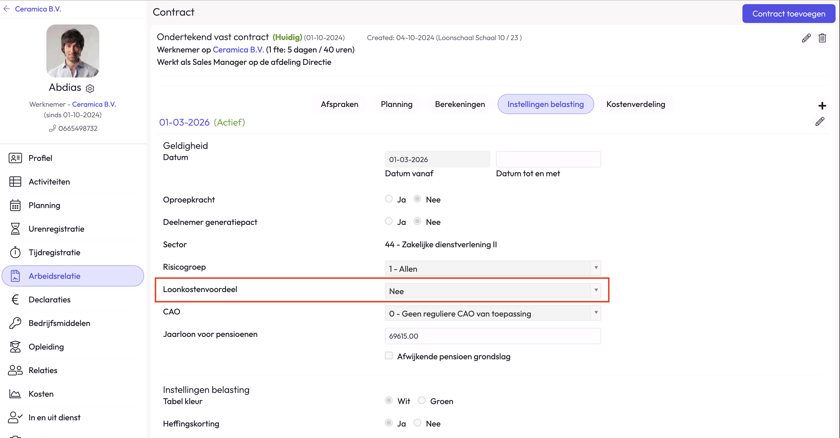 Ga naar de arbeidsrelatie van de betreffende medewerker en klik door naar 'Instellingen Belasting'.