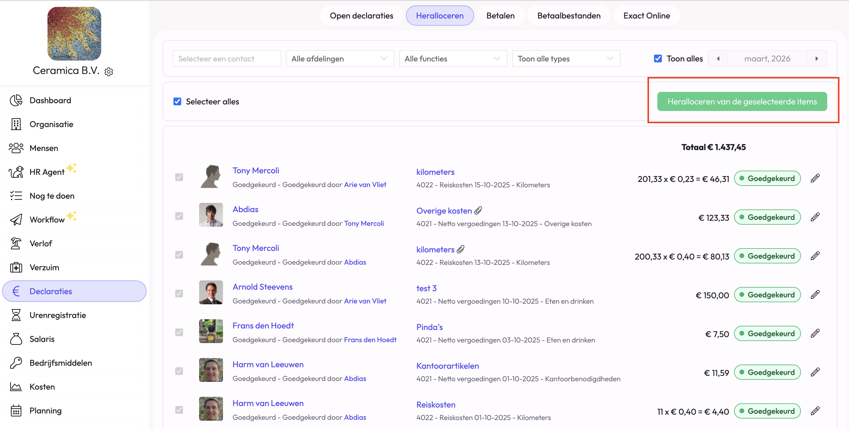 Er zijn veel verschillende manieren om declaraties door te boeken naar de financiële administratie. Er wordt ook vaak gebruik gemaakt van verschillende grootboekrekeningen, omdat men een uitsplitsing wenst in de boekhouding. Met het heralloceren van de declaraties kun je dit moeiteloos doen.