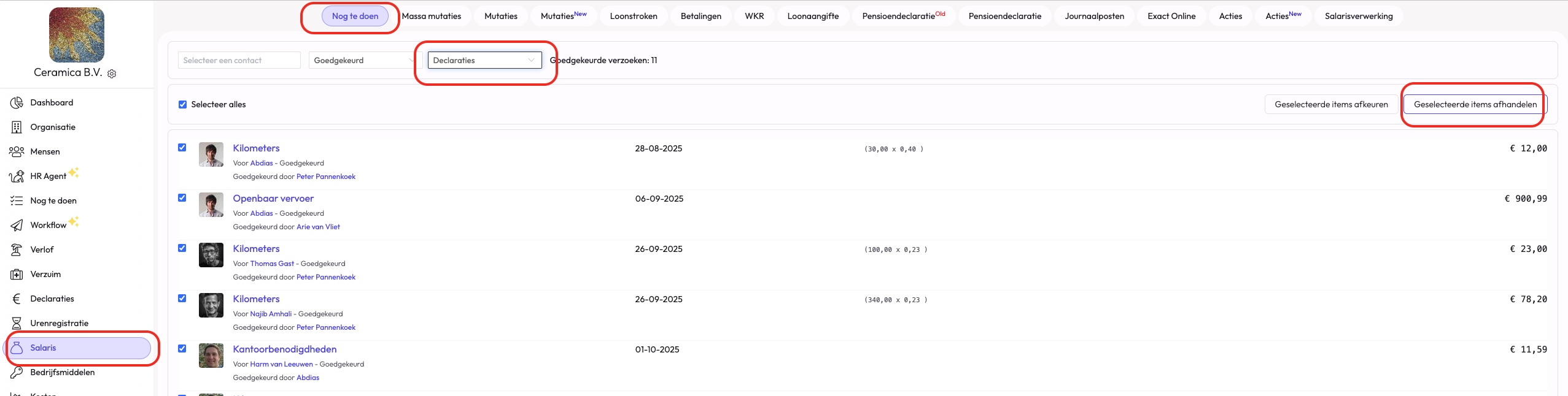 Nadat declaraties zijn goedgekeurd door de daarvoor aangewezen persoon kunnen deze worden uitbetaald. De goedgekeurde declaraties worden dan getoond in het menu 'Salaris' onder 'Nog te doen'.