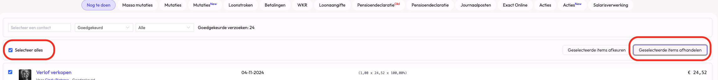 In het tabblad 'Nog te doen' in het salarismenu selecteer je de uren die uitbetaald moeten worden.