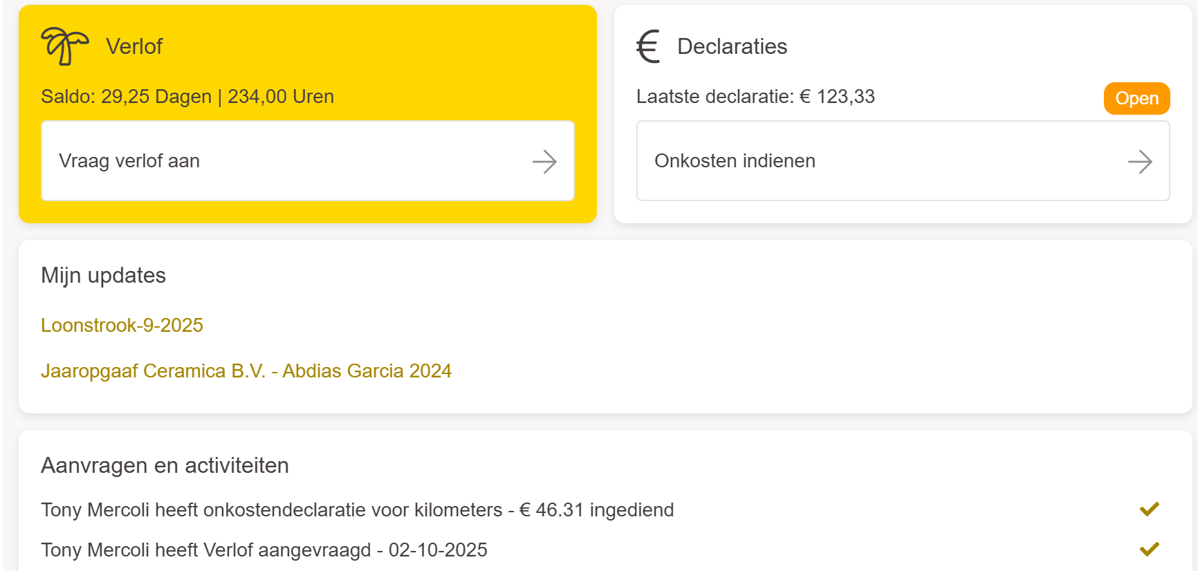(Alleen zichtbaar als je de rol ‘Werknemer’ hebt.) - Verlof – alle informatie over jouw verlofsaldo en aanvragen.