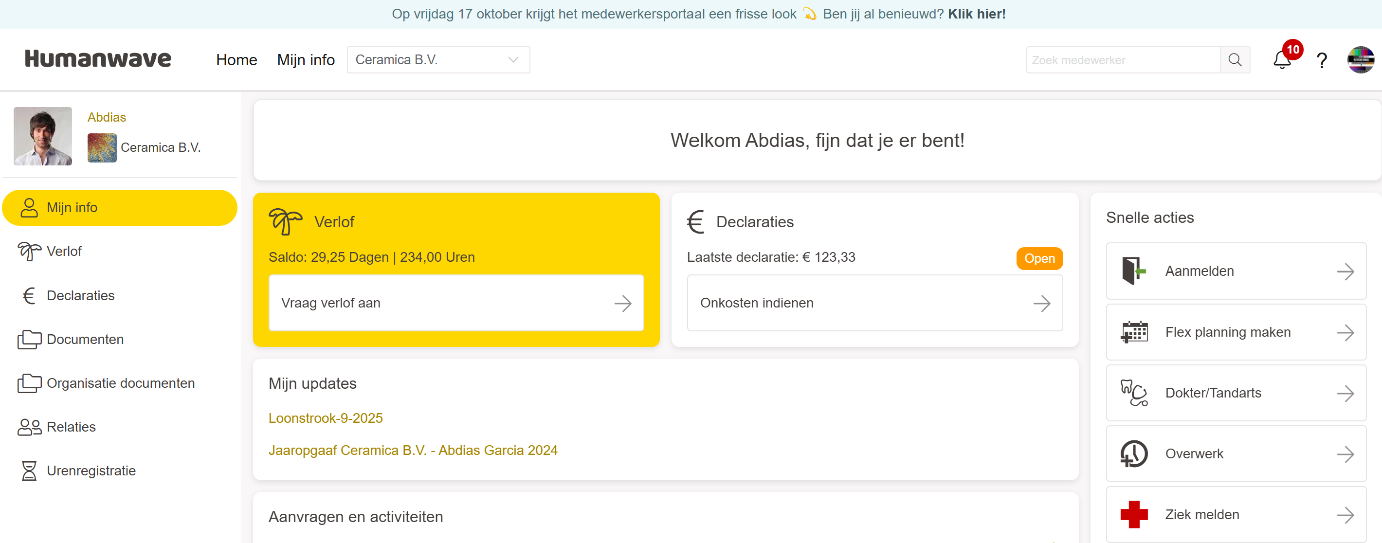 Wanneer je inlogt in Humanwave, kom je terecht op je dashboard.