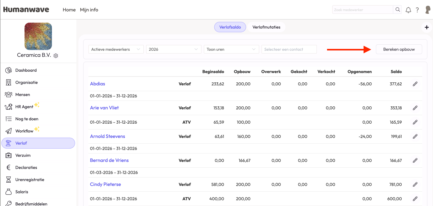 Hier zie je de optie 'Bereken opbouw' staan. Wanneer je hier op klikt, zal het verlof worden herberekend van alle medewerkers die zichtbaar zijn. Let op: wanneer niet heel de lijst met medewerkers zichtbaar is, klik dan onderaan de lijst op 'Toon meer'. Pas wanneer de hele lijst is uitgerold, zal het verlof voor alle medewerkers herberekend worden.