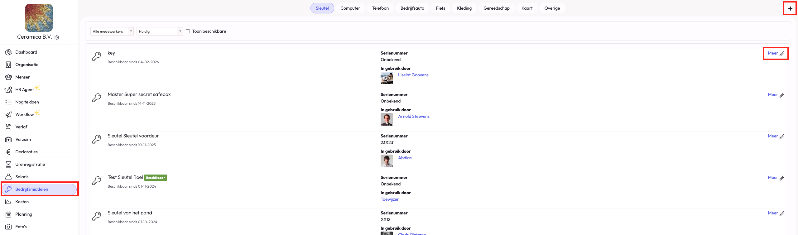 Achter het bedrijfsmiddel zie je of deze nog beschikbaar is en aan welke medewerker dit is toegewezen. Klik op het potloodje achter het beschikbare bedrijfsmiddel om deze te bewerken.