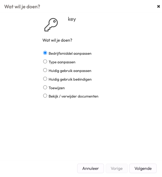 Kies voor de optie 'Bedrijfsmiddel aanpassen' en druk op 'volgende'.