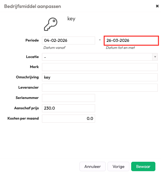 Vul hier de einddatum in van het bedrijfsmiddel en 'Bewaar'.