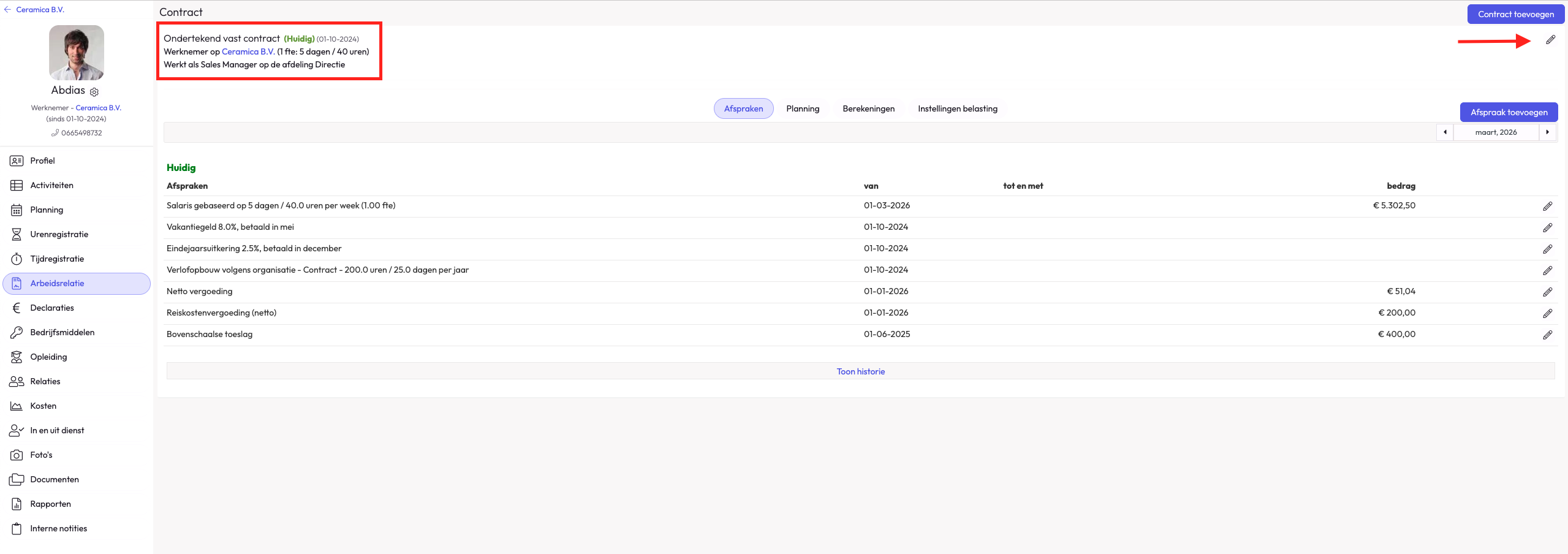 Ga naar de pagina van de medewerker en selecteer 'Arbeidsrelatie' in het linkermenu.