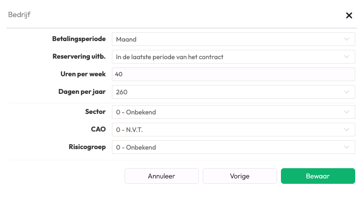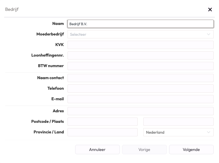 In het scherm dat opent, vul je data in van de nieuwe bedrijf