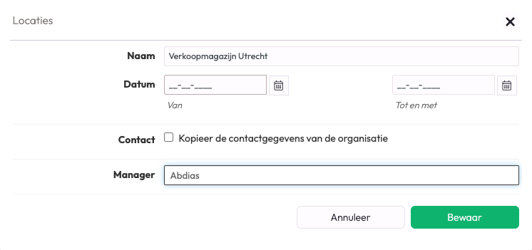 In het scherm dat opent, vul je data in van de nieuwe locatie