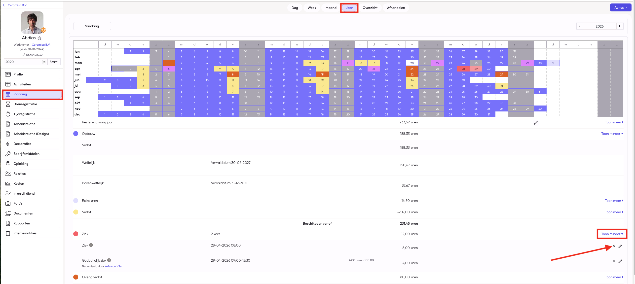 Onder de planning, in het onderdeel 'Ziek', klik je op 'Toon meer'.