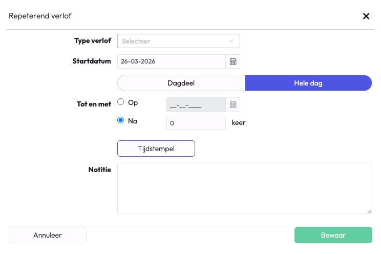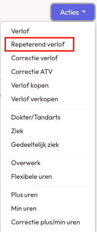 Er opent een nieuw scherm. Om het repeterend verlof aan te vragen heb je de volgende opties: