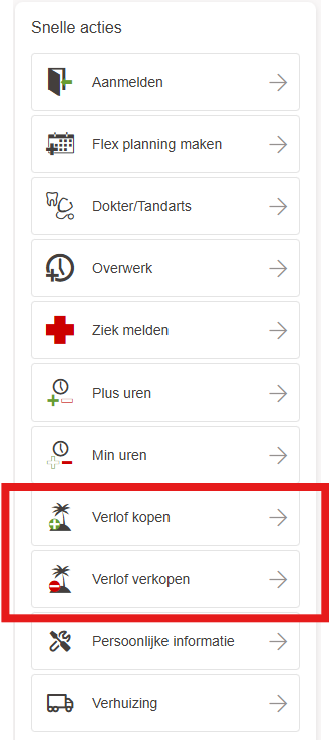 In de rechterbalk bij ‘Snelle acties’ zie je de opties ‘Verlof kopen’ en/of ‘Verlof verkopen’ als jouw organisatie deze mogelijkheid heeft geactiveerd.