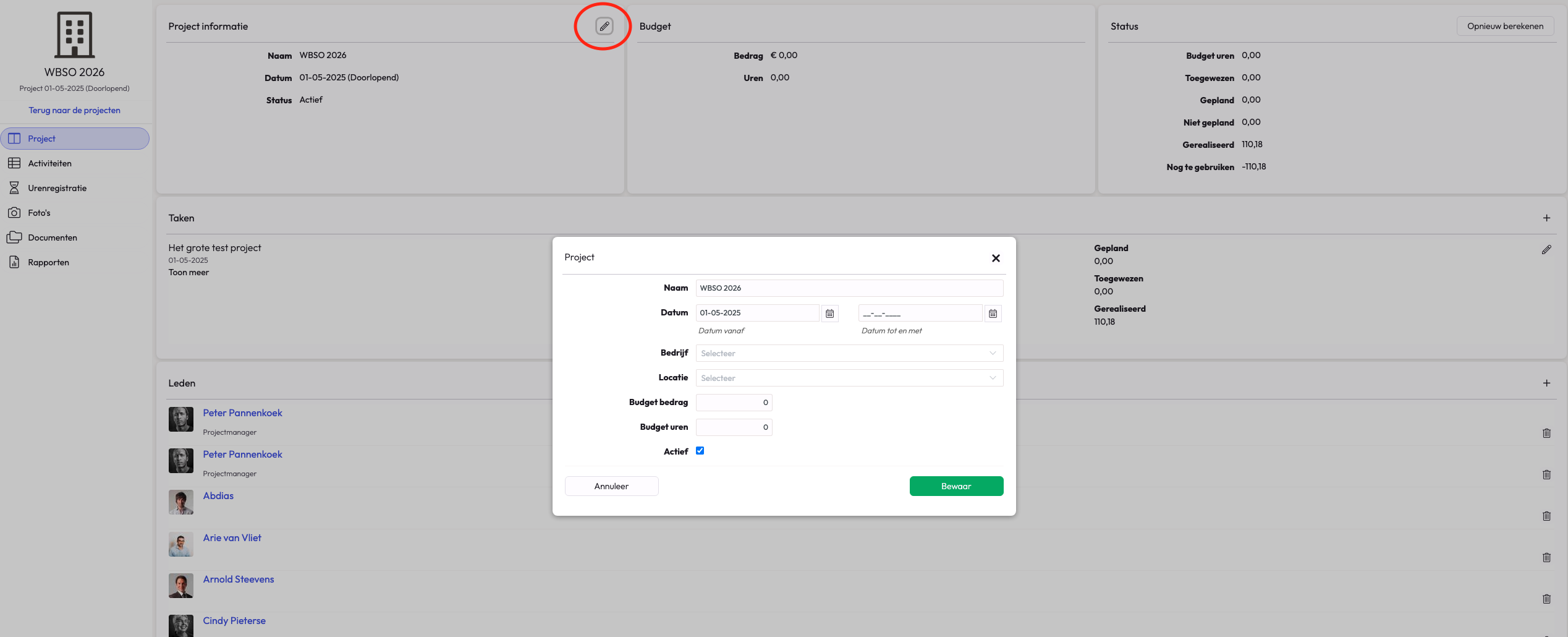 Klik op het potlood achter 'Project informatie' op de projectpagina.