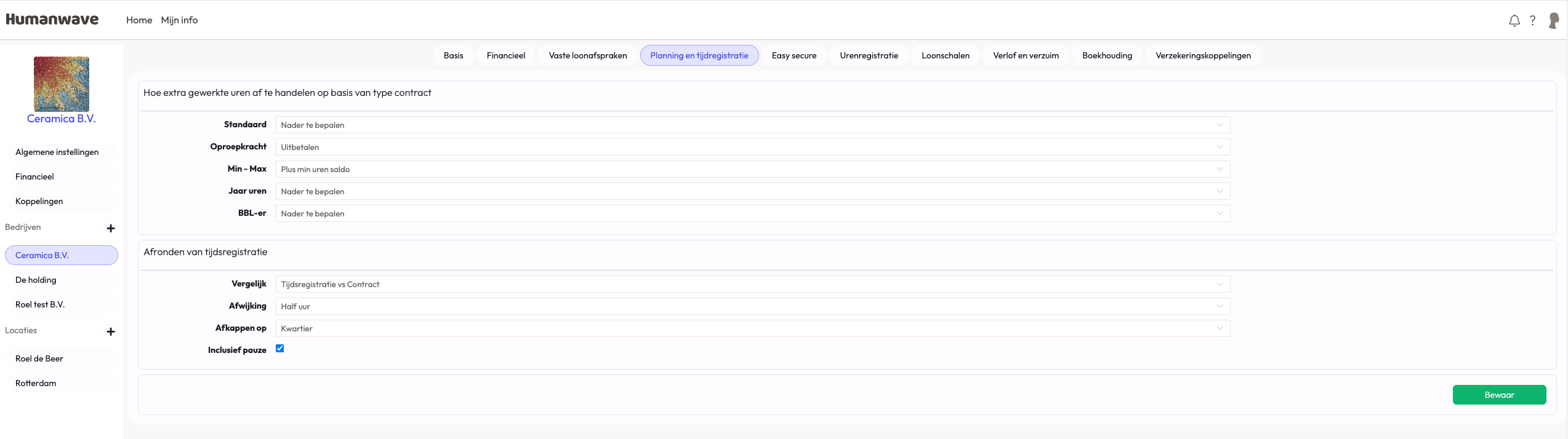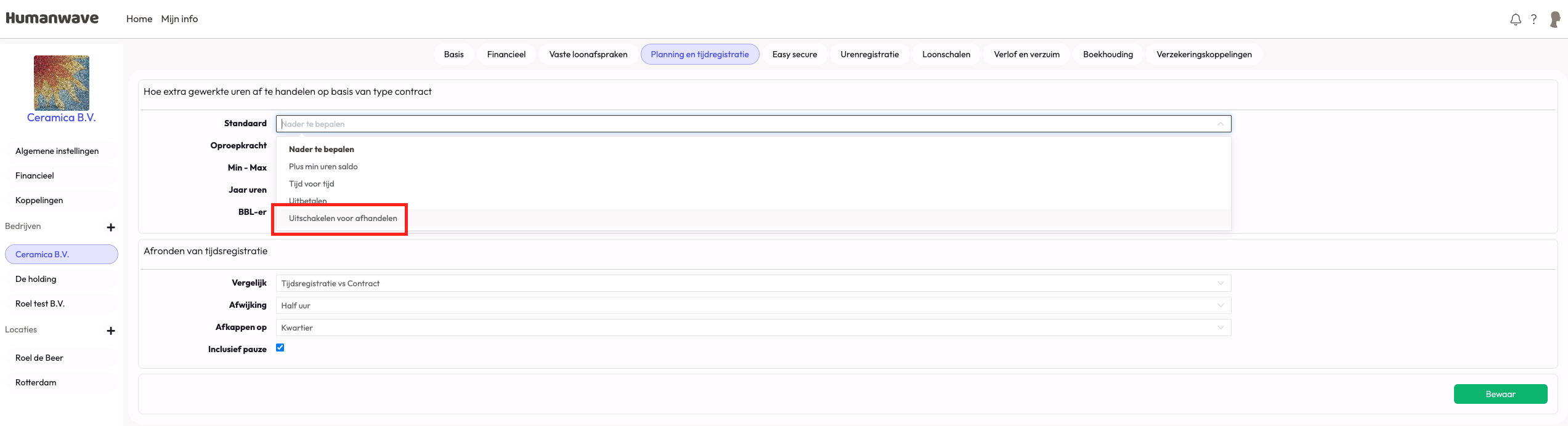 Je kan de voorkeur voor het afhandelen van extra gewerkte en minder gewerkte uren instellen binnen het bedrijf van je organisatie. Dit kan je doen door naar de algemene instellingen te gaan. Sommige medewerkers hebben een twee-wekelijks rooster, waarbij ze bijvoorbeeld de ene week 32 uur en de andere week 40 uur werken. Deze medewerkers komen constant terug in afhandelen, terwijl er eigenlijks niets hoeft te worden gedaan. Door deze medewerkers uit te sluiten wordt de lijst korter en simpeler.