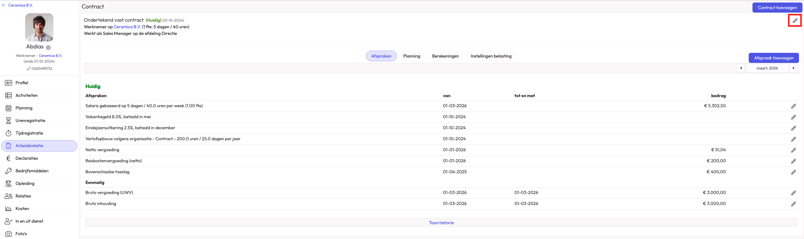 Klik op het potloodje achter het contract (direct onder de knop contract toevoegen).