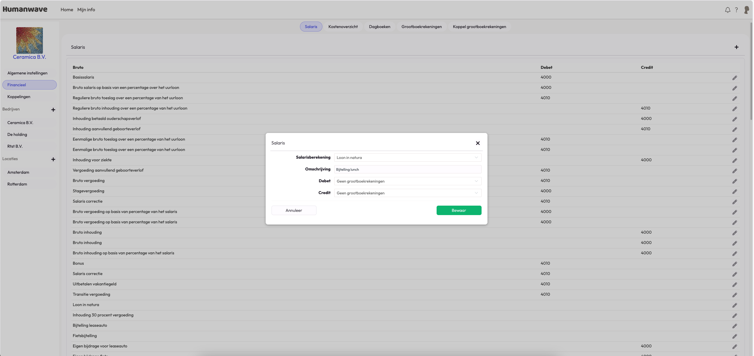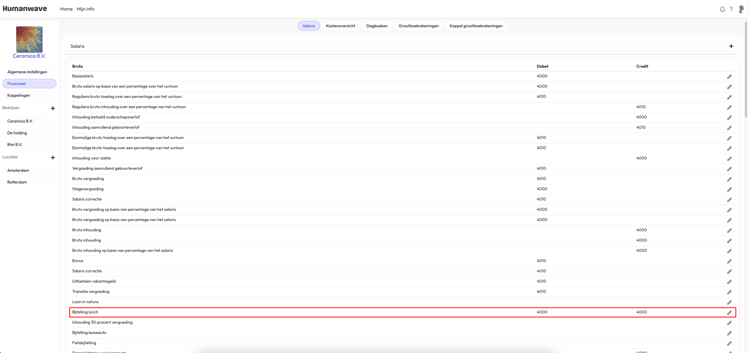 Selecteer de debet en credit grootboeken voor deze salariscomponent.