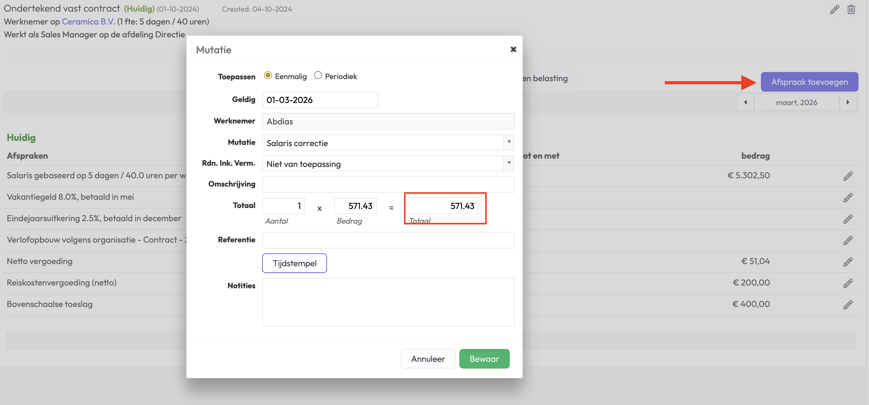 - Klik op "Voeg afspraak toe" om de Salaris correctie toe te voegen.