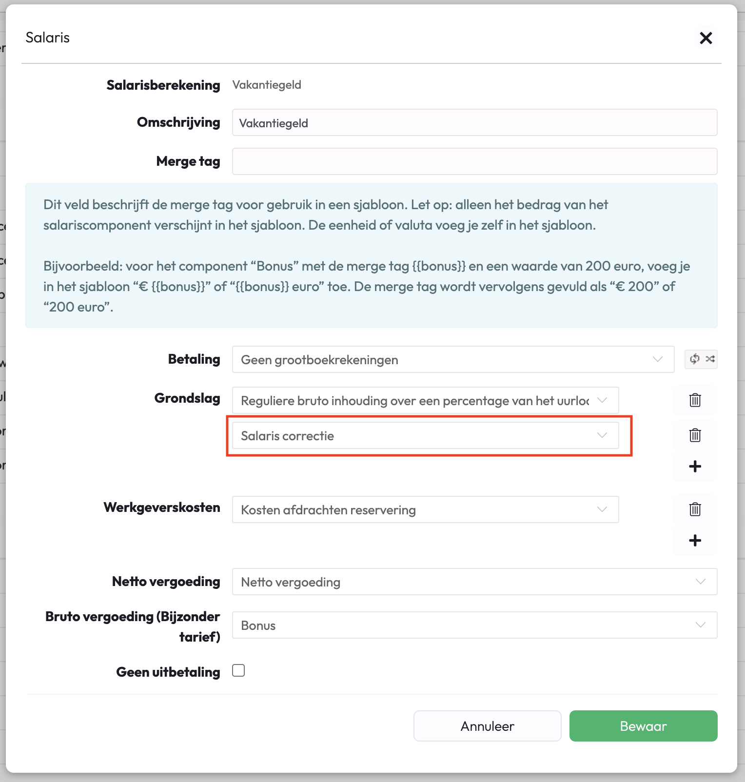 Vervolgens moeten we het component nog koppelen aan de grondslag voor het vakantiegeld en eventuele andere reserveringen die bij jou van toepassing zijn. Over het bedrag wat je corrigeert moet namelijk ook vakantiegeld gereserveerd worden.