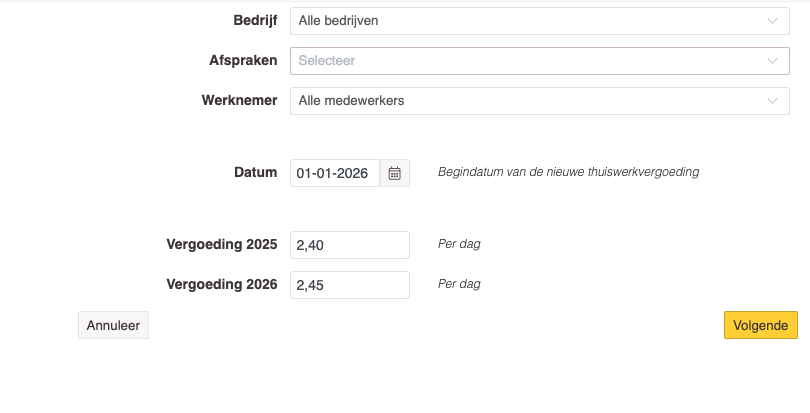 Op 1 januari 2026 zal het maximum voor de onbelaste thuiswerkvergoeding verhoogd worden van €2,40 naar €2,45 per dag.