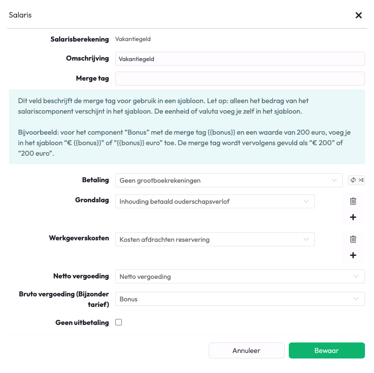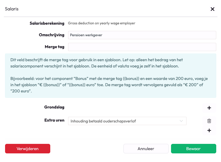 - Voeg achter grondslag, via het plusteken, het zojuist aangemaakte component aanvullend geboorteverlof toe.