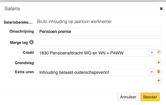 Indien van toepassing, moet de inhouding ook worden verwerkt in de pensioen premie. Het afhankelijk van het pensioenfonds. Dit pas je als volgt aan: