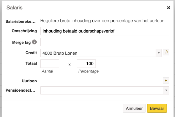- Bij extra uren zet je Inhouding betaal ouderschapsverlof neer