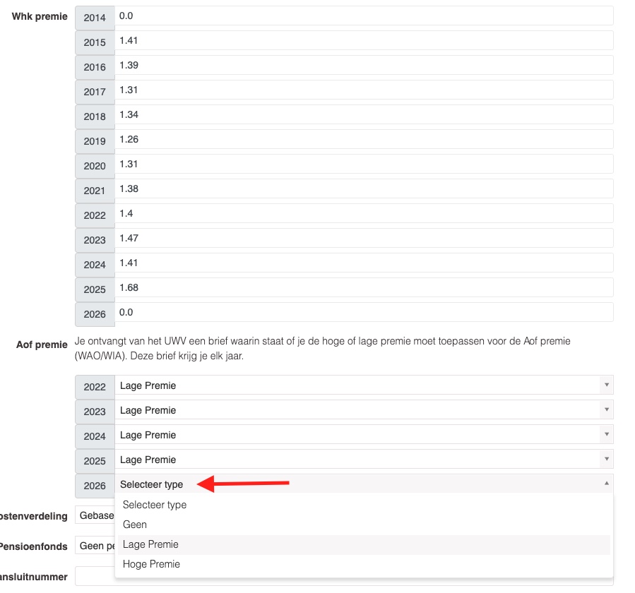 Scroll vervolgens naar de onderkant van de pagina onder het tabblad 'Basis'. Onder de tabel waar het Whk premiepercentage wordt ingevoerd, kun je voor 2026 de Aof indeling selecteren.