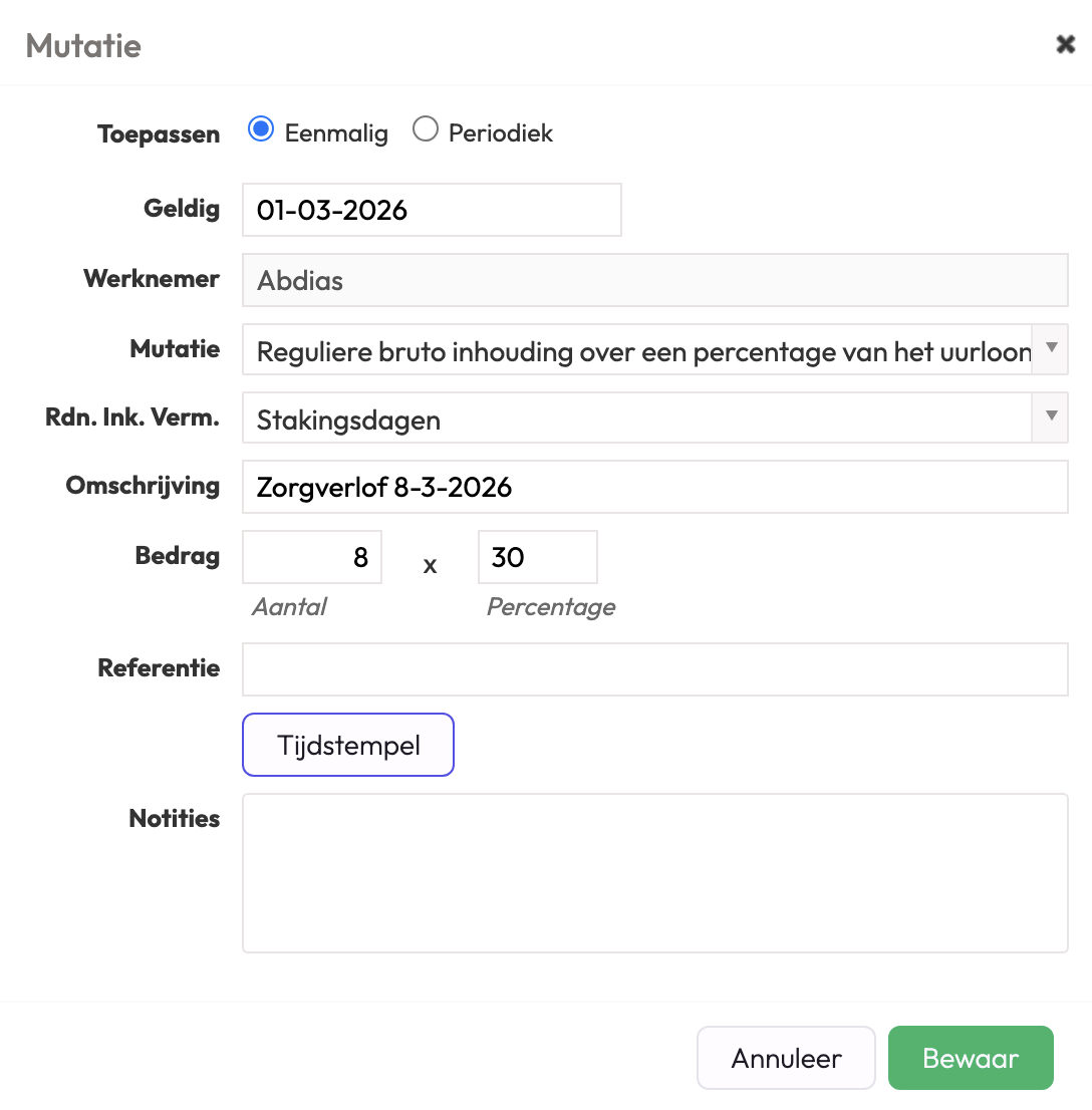 - Bedrag: aantal uur dat er zorgverlof is opgenomen & het percentage welke ingehouden mag worden.