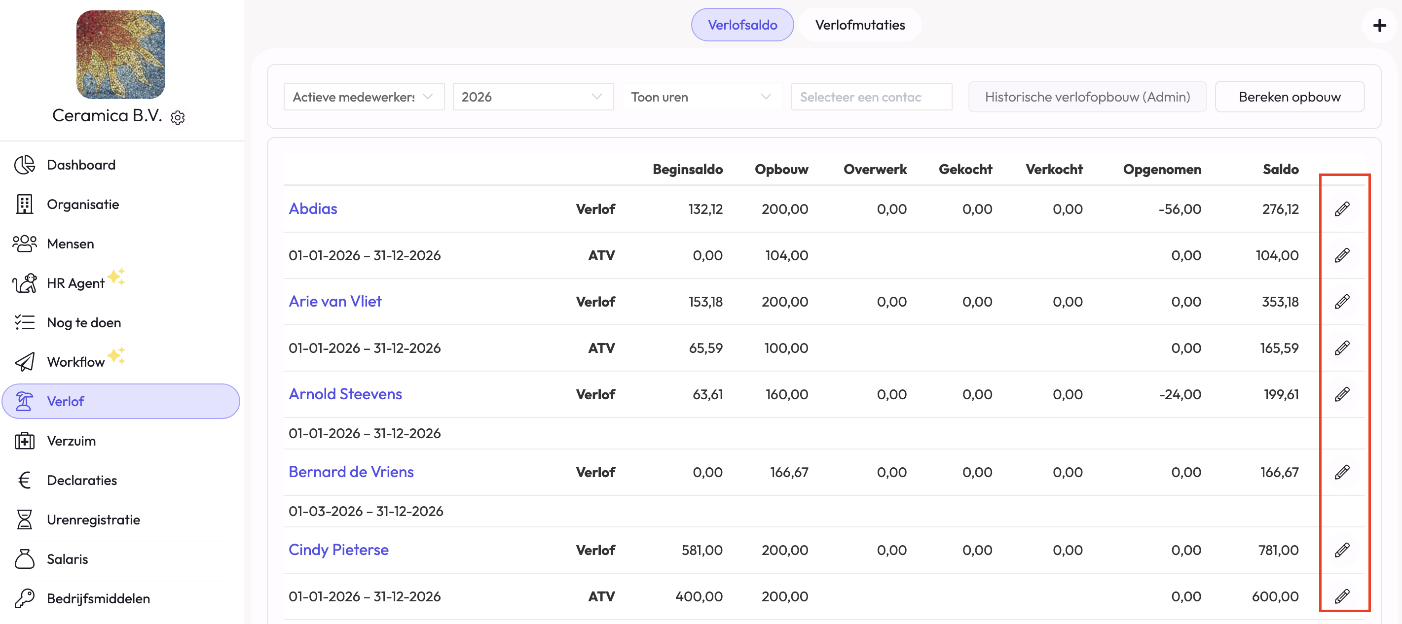 Om het beginsaldo van het verlof in te stellen per medewerker, klik je op het potlood rechts van een medewerker.
