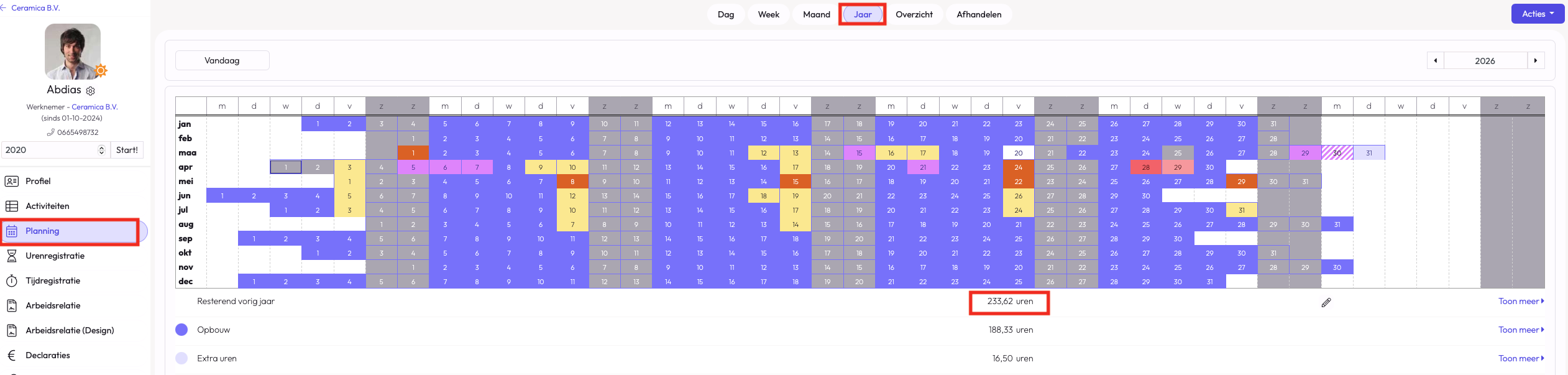Het verlofsaldo wordt toegevoegd aan de medewerker. Je kan dit op werknemersniveau terug zien in de 'Planning' van de medewerker. Onder het tabblad 'Jaar' bij de medewerker staat nu bovenaan: 'Resterend vorig jaar' met daarachter het aantal uren dat je hebt ingesteld bij het beginsaldo (zie hieronder).