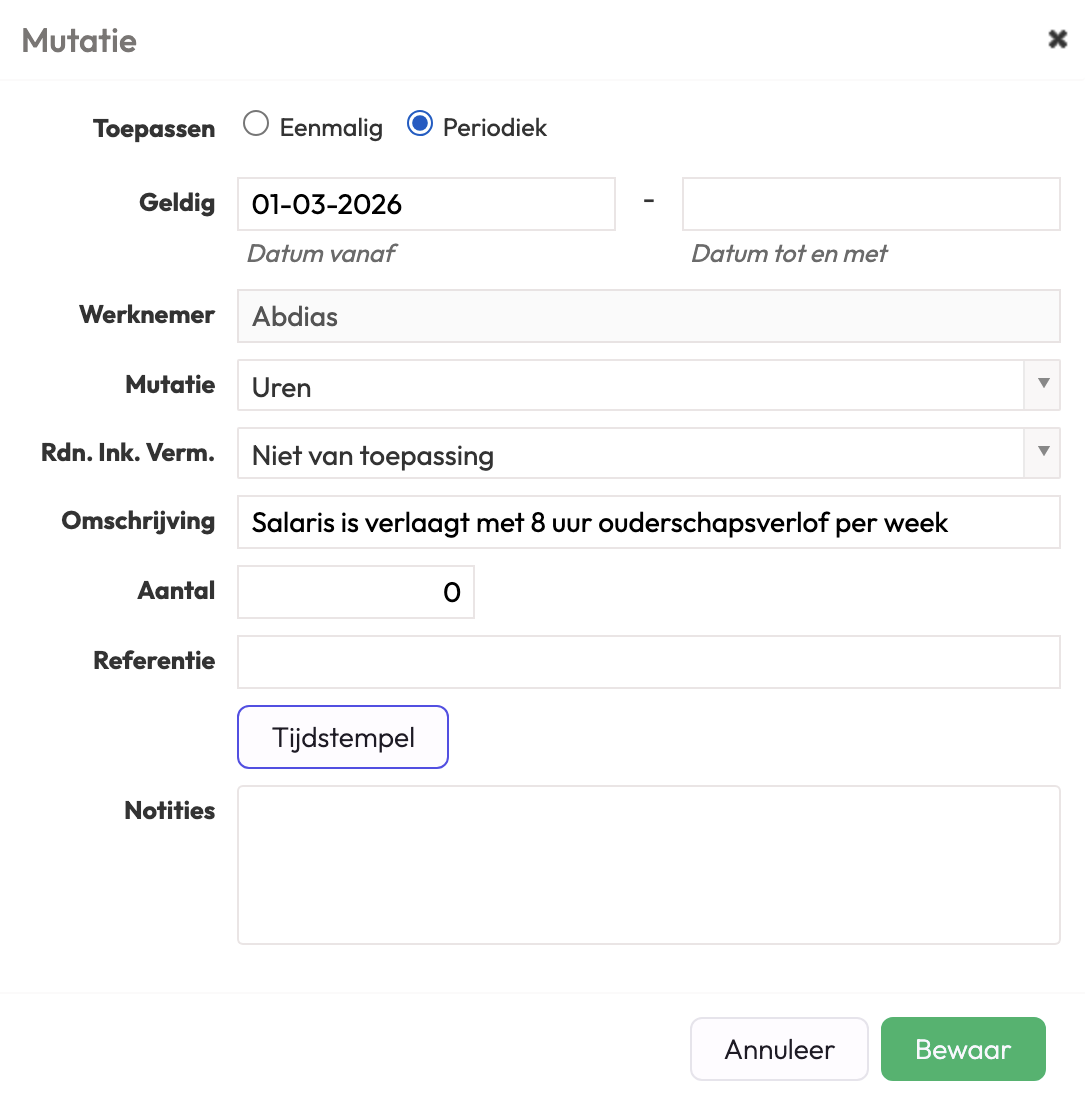 Voorbeeld 2: De medewerker gaat meer werken, van 32 uur naar 40 uur in de week.