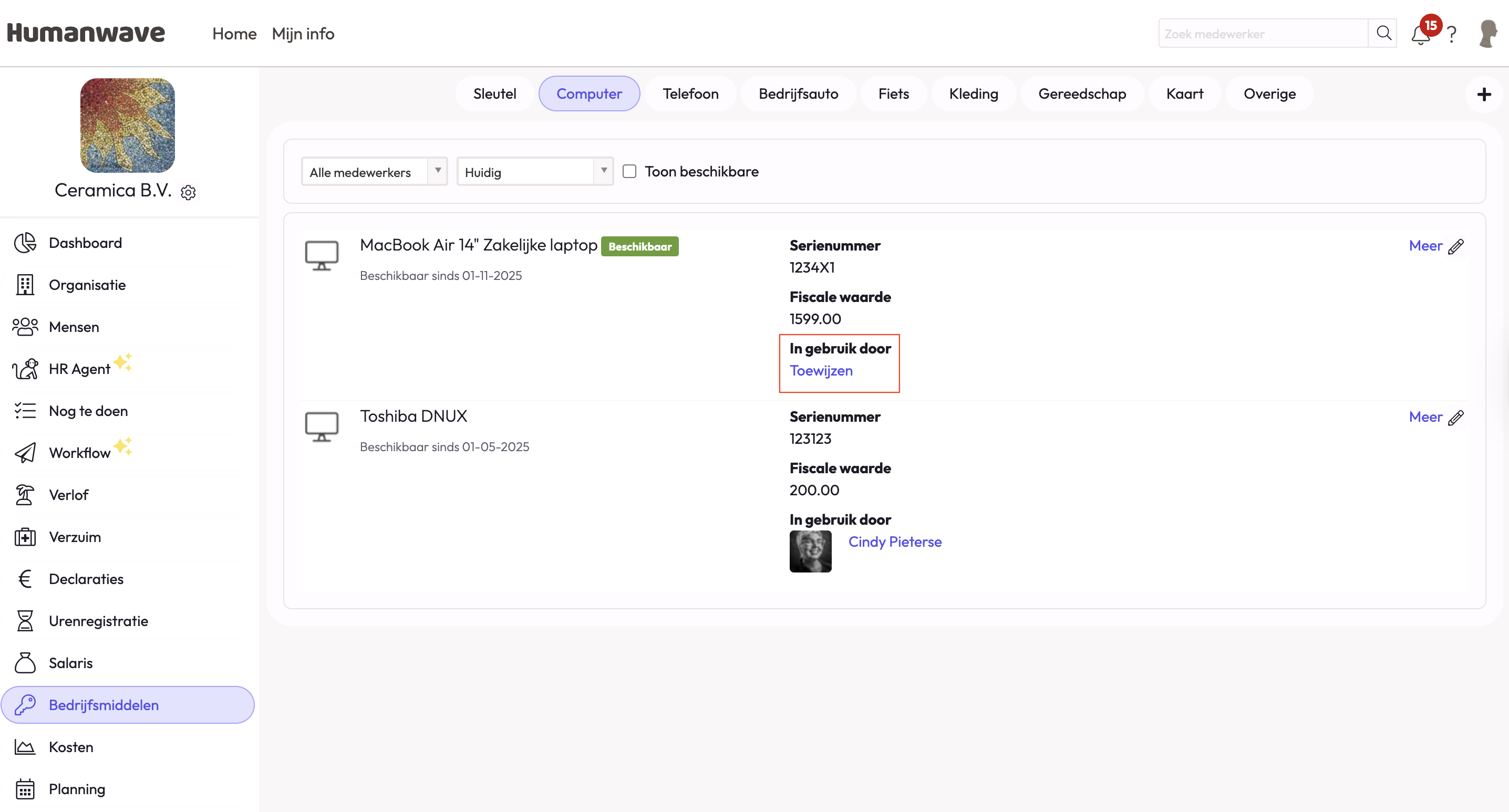 Het bedrijfsmiddel is nu beschikbaar en kan toegewezen worden aan een medewerker. Om het bedrijfsmiddel toe te wijzen aan een medewerker klik je op 'Toewijzen' achter het betreffende bedrijfsmiddel dat je iemand toe wilt wijzen: