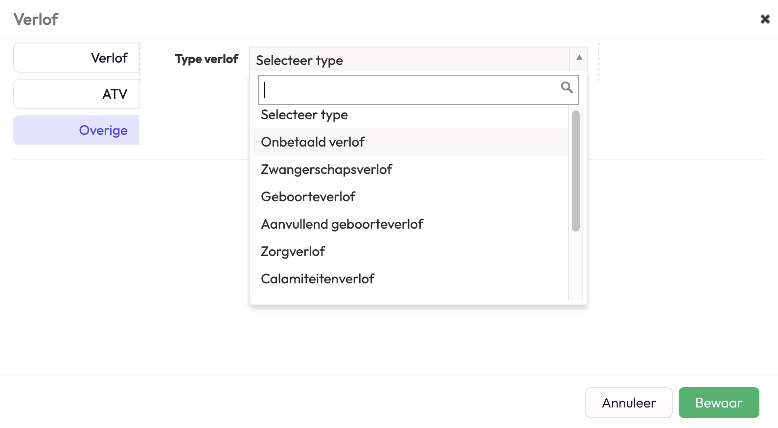 Kies links voor 'Overige' en selecteer bij type verlof voor "Geboorteverlof" of "Aanvullend geboorteverlof"