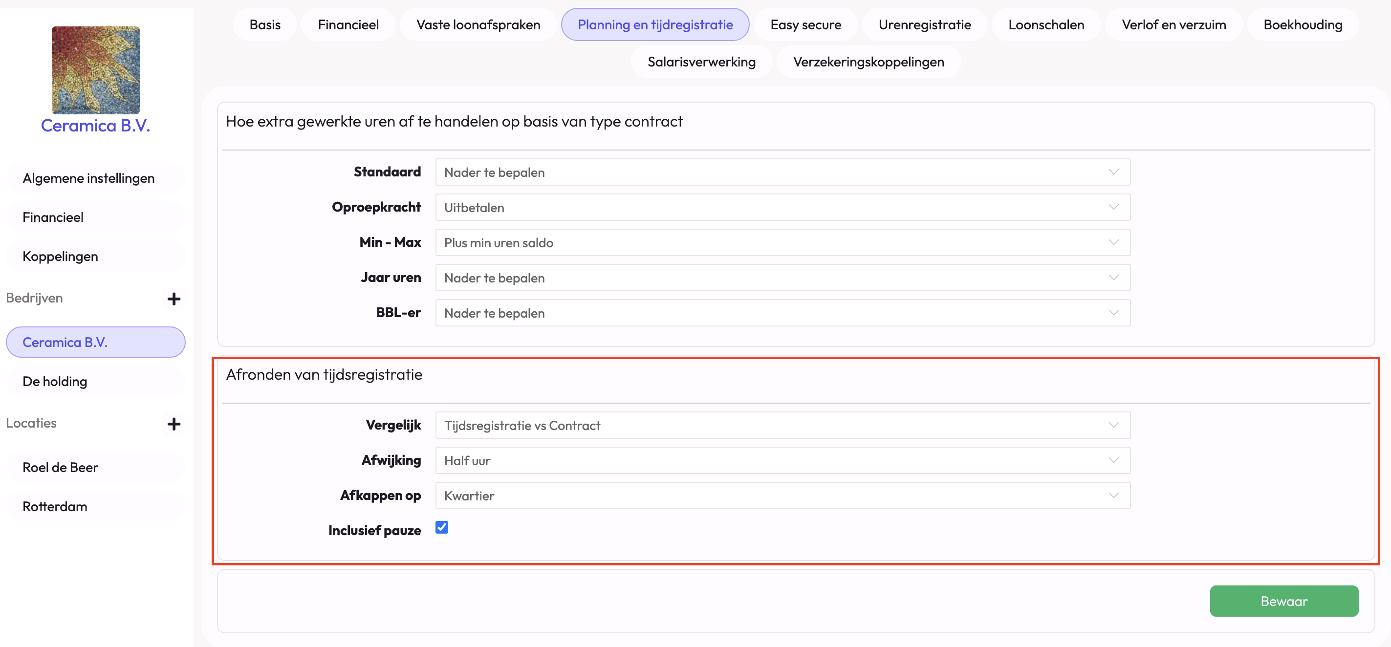Vervolgens selecteer je in het linkermenu het juiste bedrijf, de instellingen voor tijdsregistratie zijn namelijk per bedrijf in te stellen.