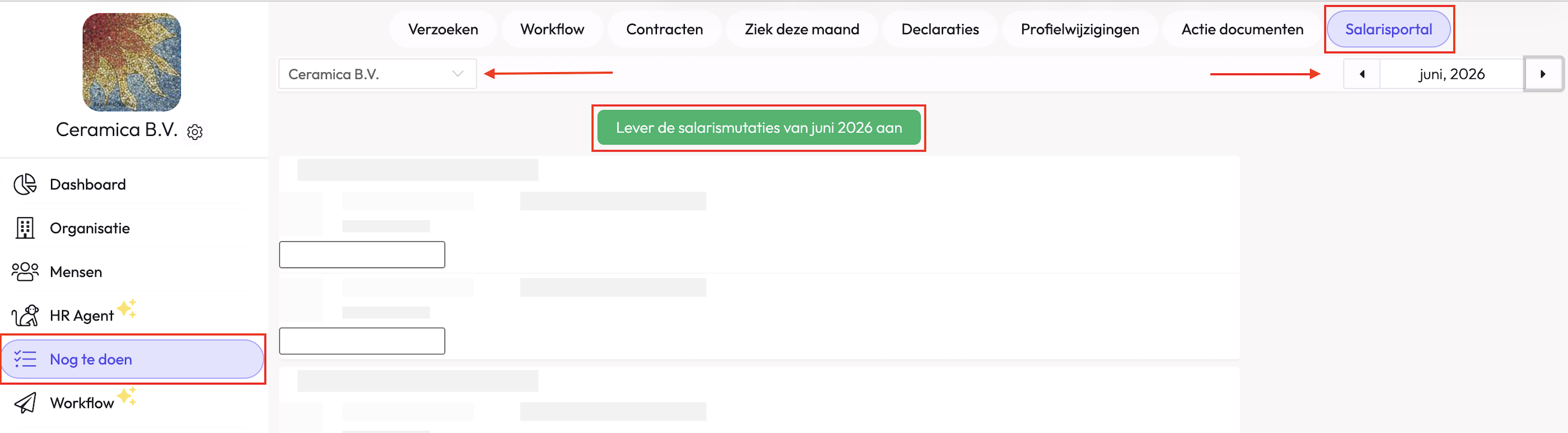 Selecteer het bedrijf en periode waarvoor je de mutaties voor de maand/loonperiode wilt invoeren en klik op de groene button ‘Lever de salarismutaties van <periode> <jaar> aan’.