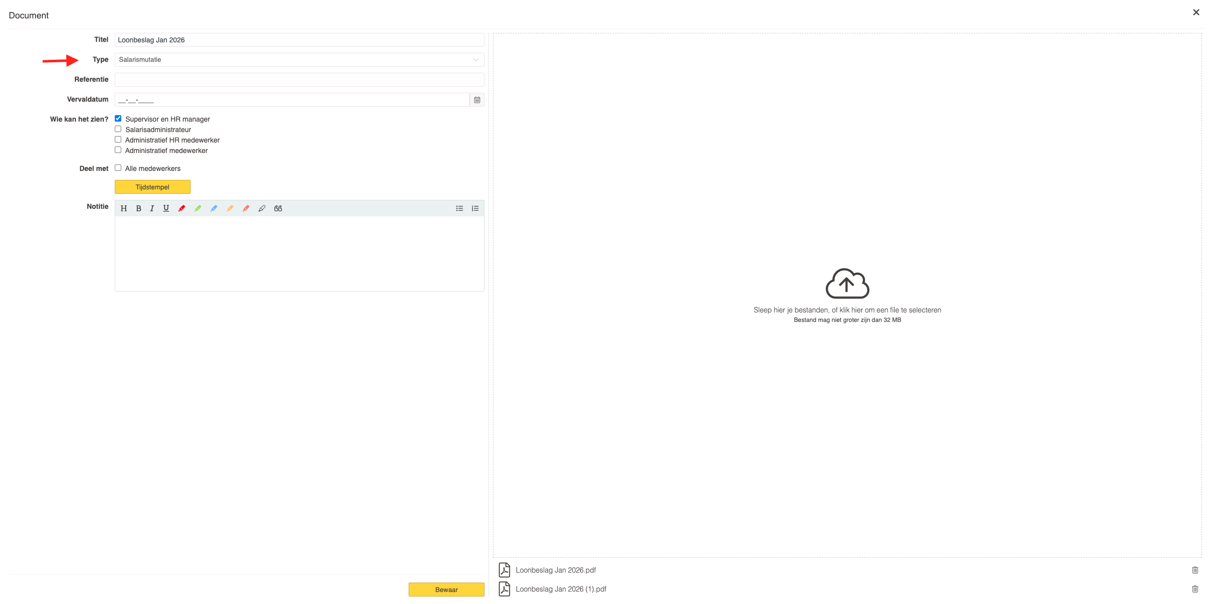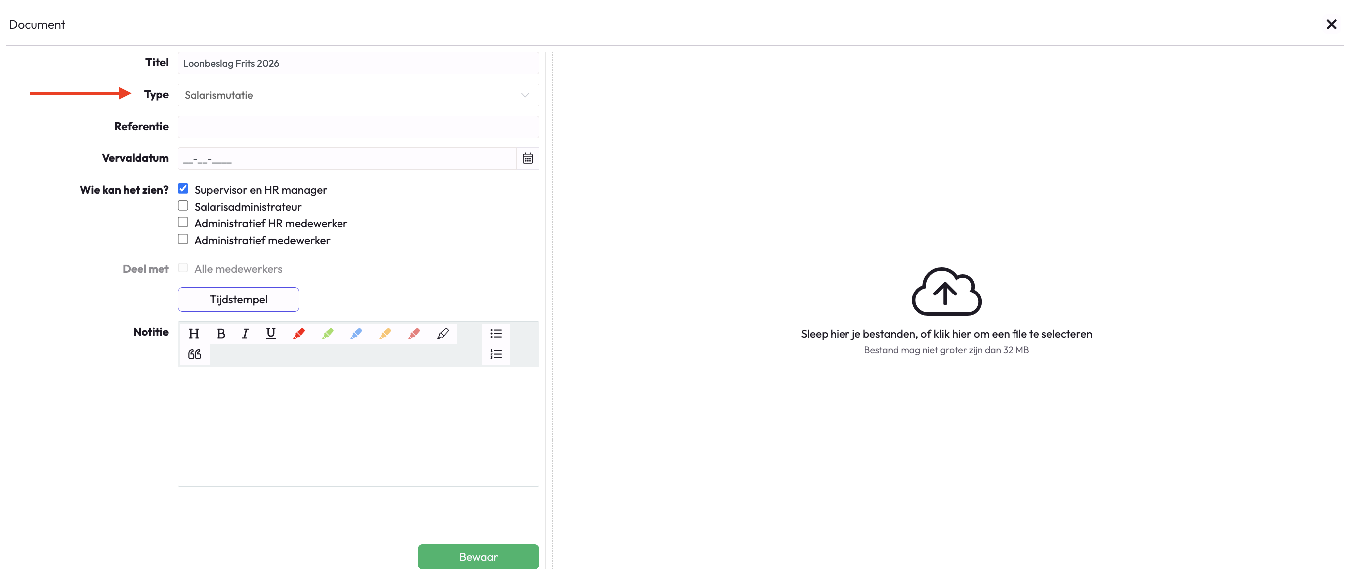 - Geef het document een duidelijke naam, zoals Loonbeslag Frits en selecteer bij type: 'Salarismutatie'