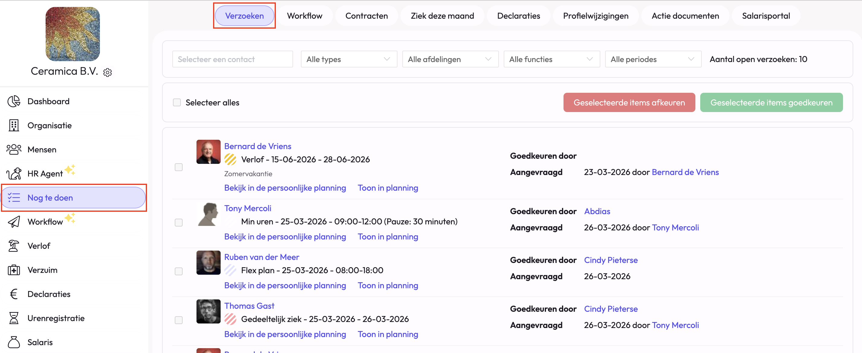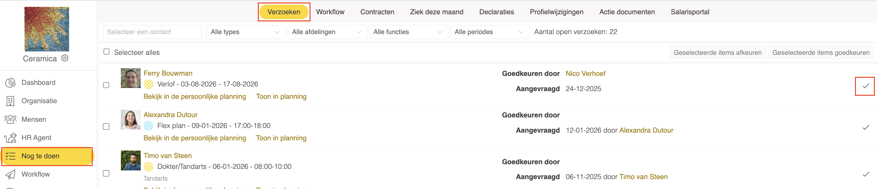 1a. Om ervoor te zorgen dat je niets vergeet, adviseren wij je eerst alle openstaande verzoeken in het tabblad ‘Nog te doen’ > ‘Verzoeken’ goed te keuren, te bewerken of af te wijzen.