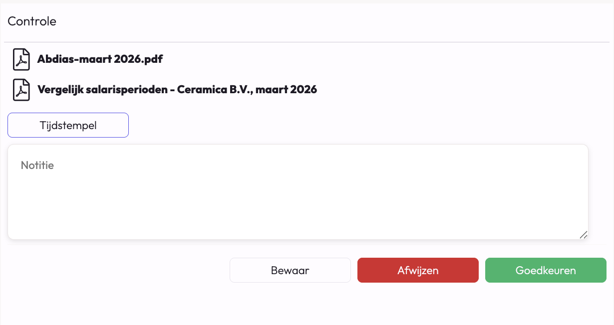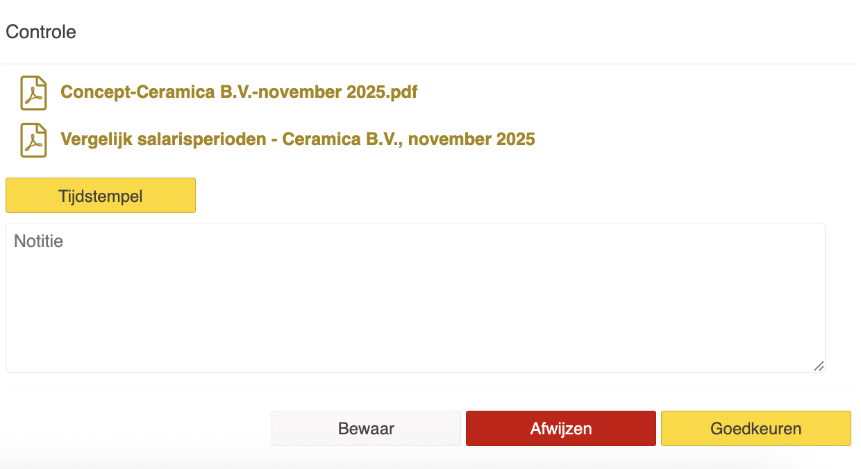 2. De Goedkeuring: de concept loonstroken zijn in orde. Wanneer je op ‘Goedkeuren’ klikt, wordt er een melding verstuurd naar onze Salaris Experts. Zodra de definitieve bestanden gereed zijn, ontvang je opnieuw een e-mail.