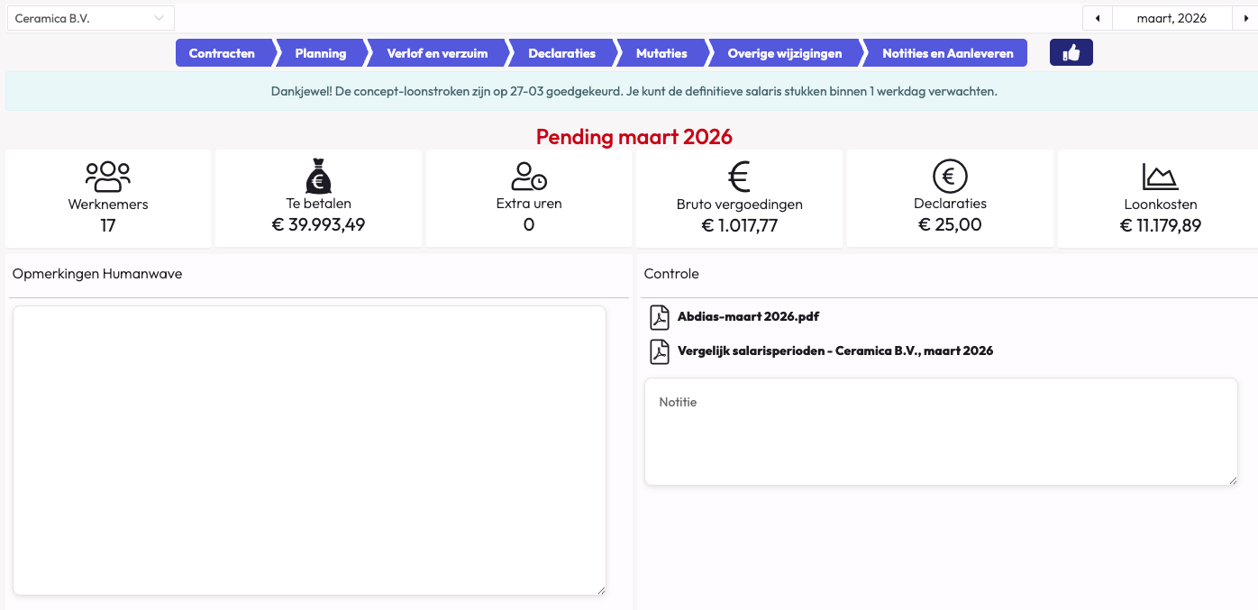 De Salaris Experts van Humanwave zijn nu aan zet en gaan met de maand/loonperiode aan de slag. Je moet rekening houden met een verwerkingstijd van 7 werkdagen door onze Salaris Experts. Je kunt daarom het beste de salaris mutaties wanneer je de 25ste betaald, de 15de van de maand de salarismutaties aanleveren.