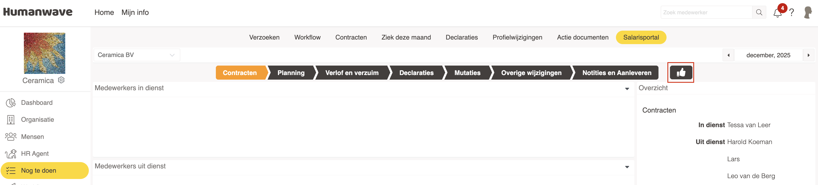 1b. In het tabblad ‘Nog te doen’ > ‘Contracten’ zie je in één oogopslag van de huidige maand de mensen die in dienst zijn gekomen, uit dienst gaan en de contractverleningen. Is van de mensen die genoemd alles op orde voor de te verlonen periode? Neen, onderneem - tijdig - de juiste acties voor een correcte loonstrook.