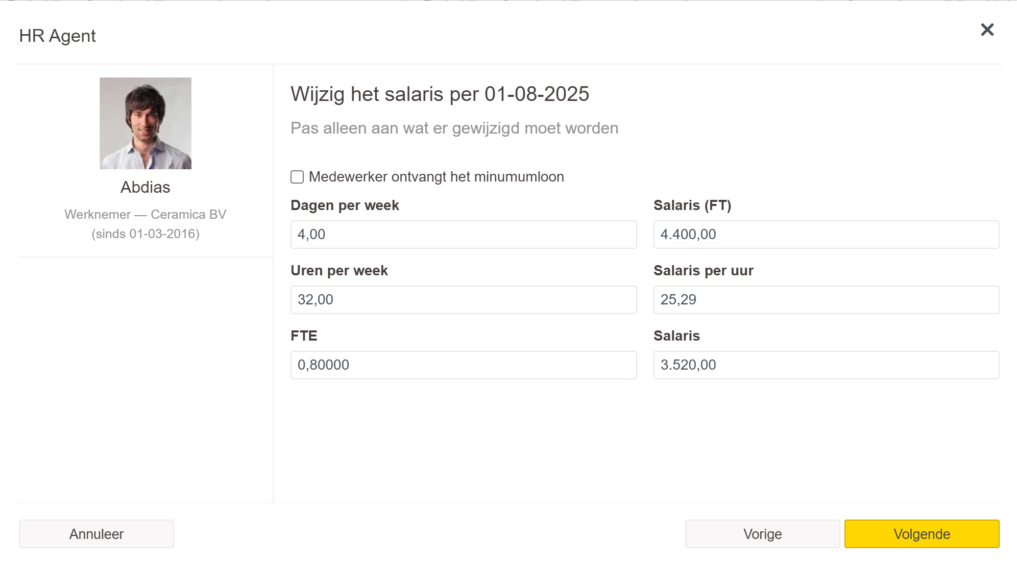 Hierdoor zullen ook de andere velden, zoals het ‘FTE”, het ‘Salaris per uur’ en het ‘Salaris’ veld, herberekend worden op basis van de aangepaste uren per week.