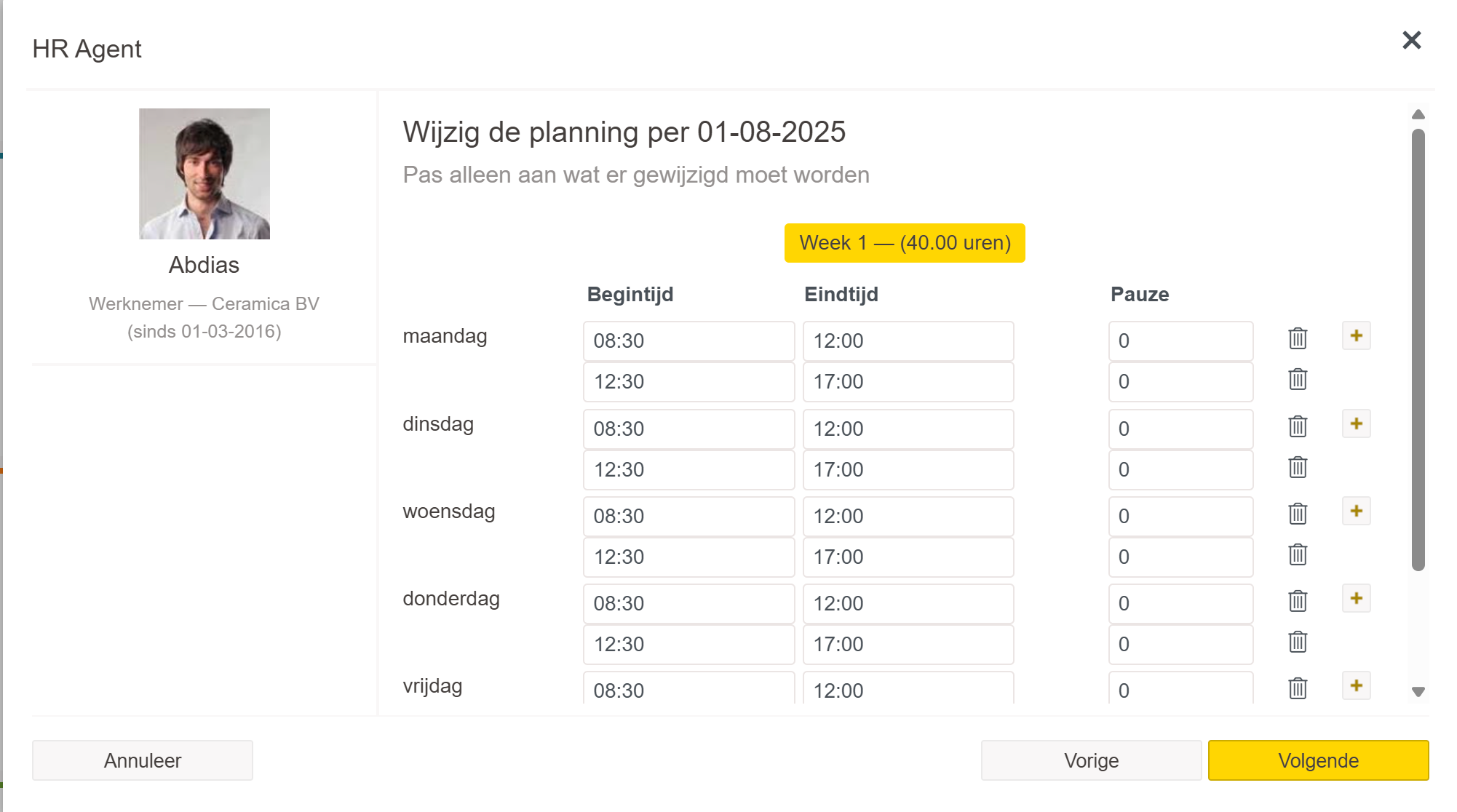 De aanpassing van de ‘Uren per week’ wordt automatisch gedaan met de uren die in het vorige scherm zijn ingevuld.