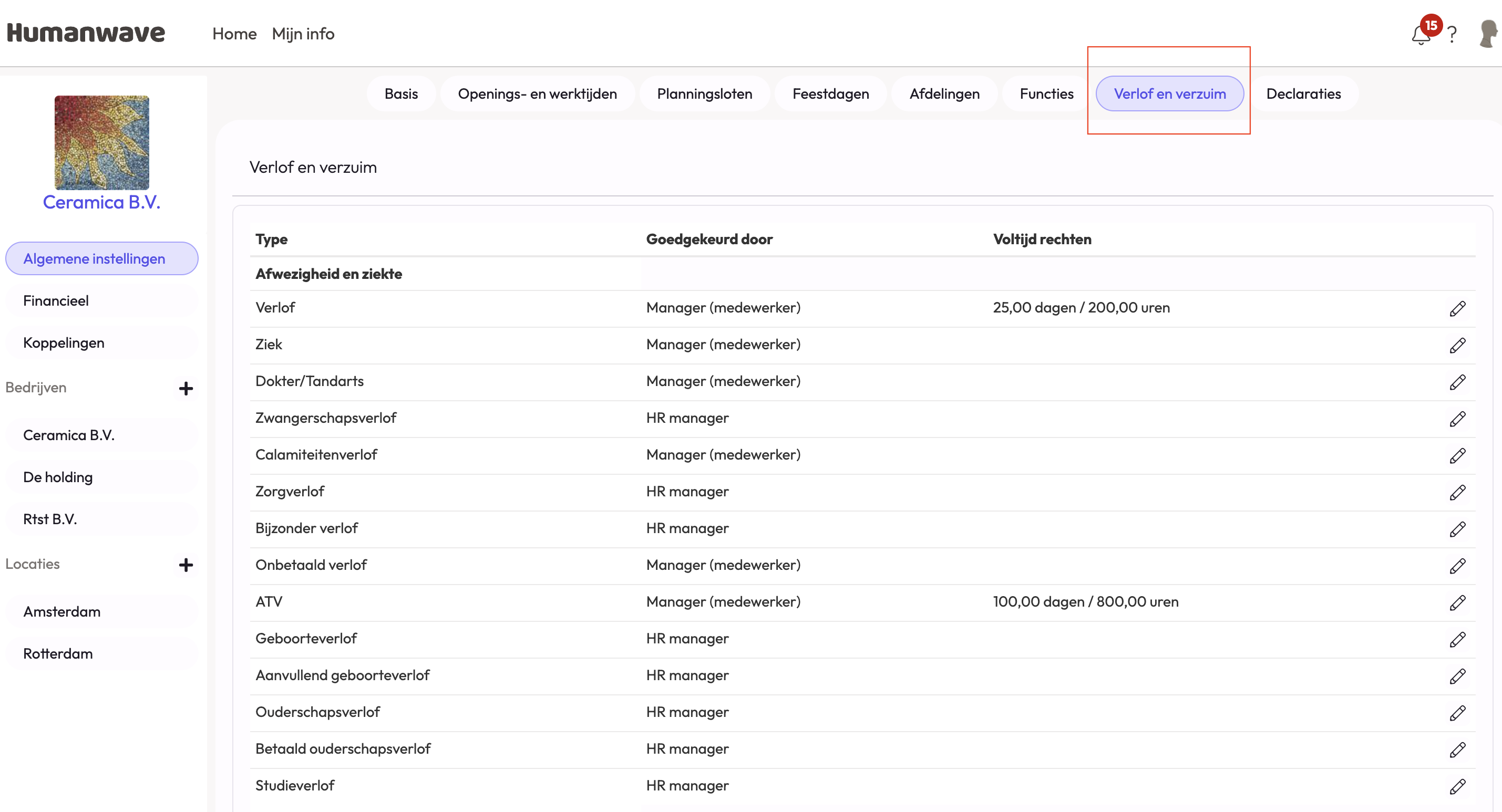 Klik op het potloodje achter een van de verlof- of planningstypes
