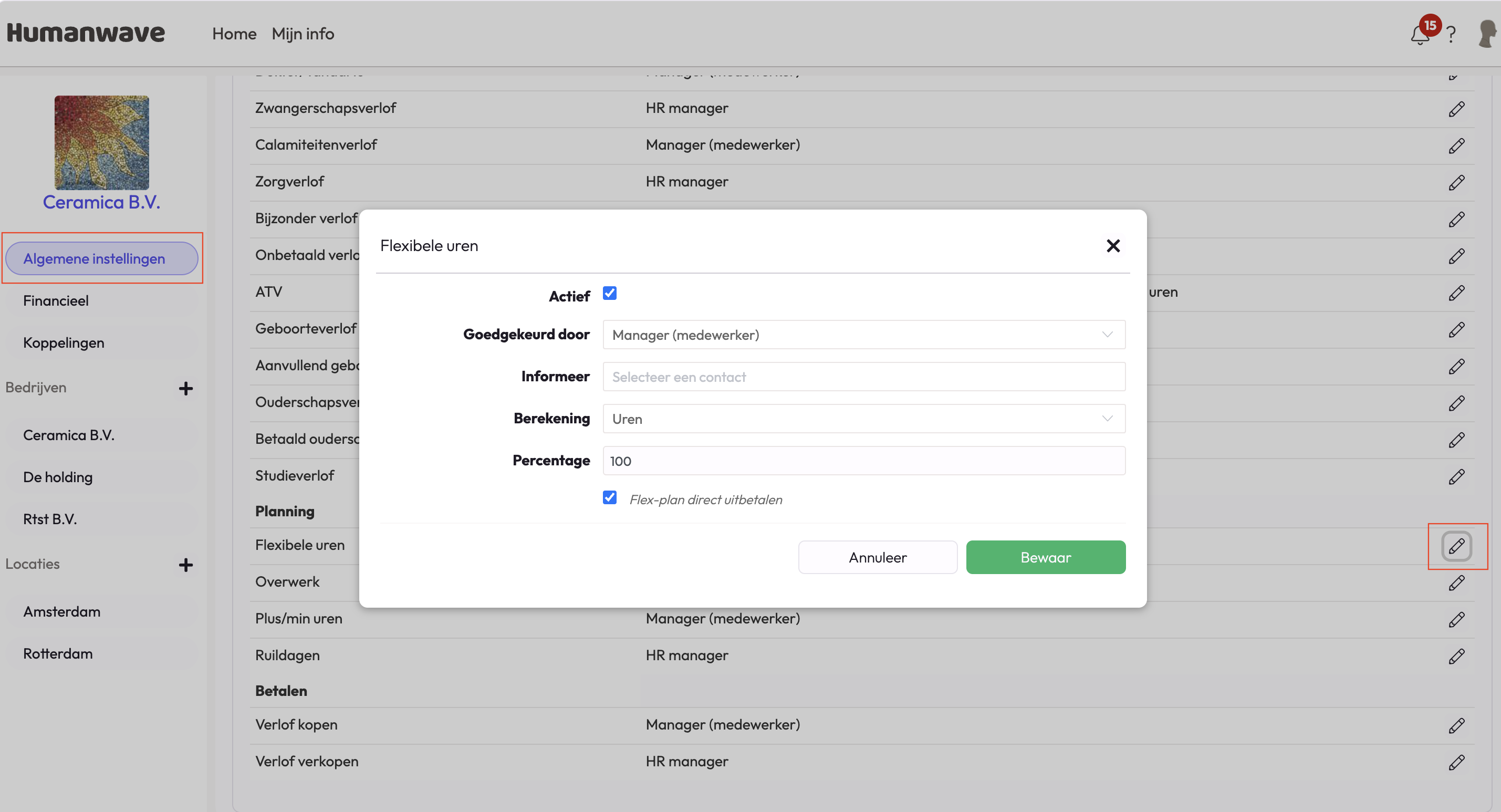 Verlofaanvragen goed- en afkeuren In Humanwave kun je zelf bepalen wie verlofaanvragen mag goedkeuren. Dit zorgt voor flexibiliteit per organisatie en voorkomt onnodige vertraging bij verlofverzoeken. Je stelt dit in via: Organisatie → Algemene ...