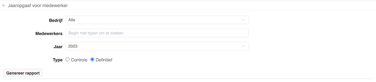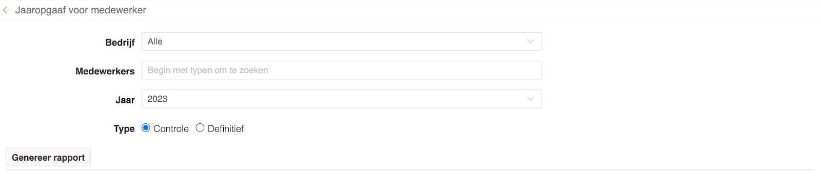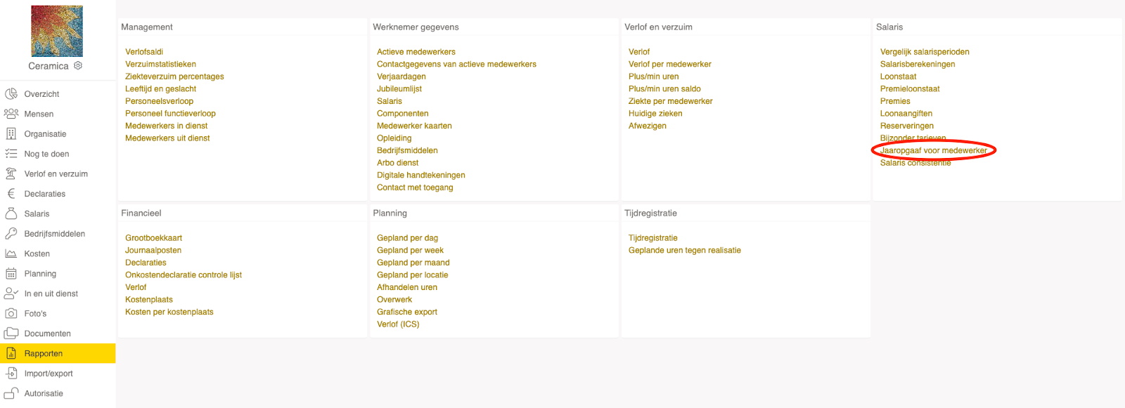 Ga naar het menu 'Rapporten' en kies voor het rapport 'Jaaropgaaf voor medewerker'.