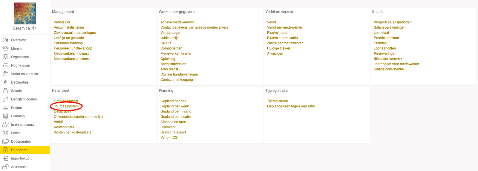 Ga op organisatie niveau naar 'Rapporten' en open 'Journaalposten' onder het kopje 'Financieel'